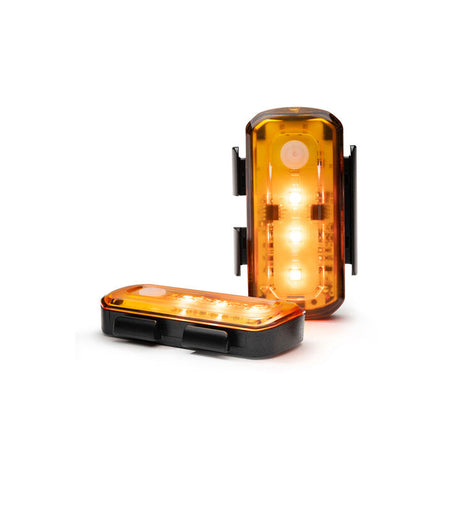 We understand being able to see in the dark is important, but we also believe that so is being visible to cars. A recent study by the National Highway Traffic Safety Administration (NHTSA) showed 27% of bicycle accidents are side impacts and 30% of fatalities occur in intersections (between 2010-2017). Being seen from all angles while cycling has never been easier. The Grid Side Beacon was imagined to work with head/tail lights to keep you more visible from a full 360 degrees. Designed to be mounted to either side of your fork with reusable silicone straps, the Grid Side Beacon can be used as a stand-alone light, or as part of our Luminate 360 Light Set. Spec'd with eye-catching amber-colored LEDs, the weather-proof, rechargeable Grid Side Beacon set comes with a dual-headed charger and has a runtime of up to 6 hours for multiple days of commuting illumination.